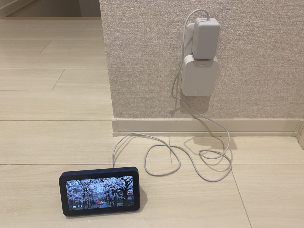 バッテリー式のスタンドのため、スタンドを充電する必要がありますが、Echo Show 5純正ケーブルをスタンドに接続すればOKです。